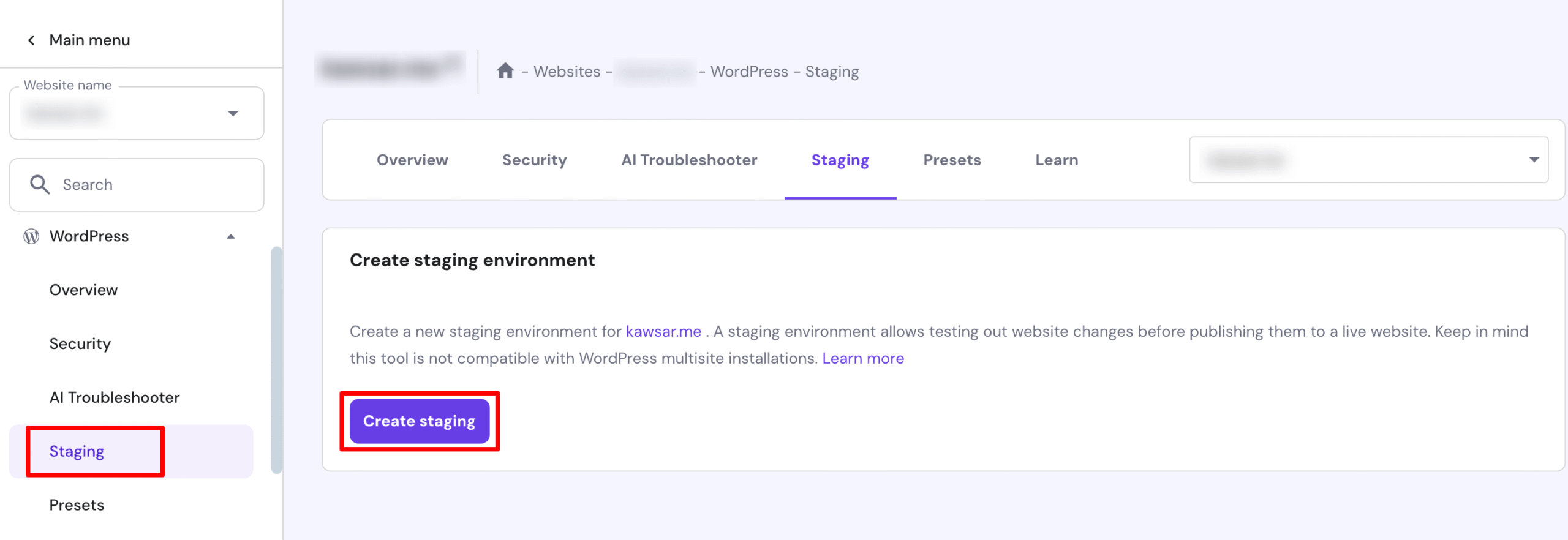 Hosting dashboard staging button screenshot